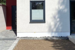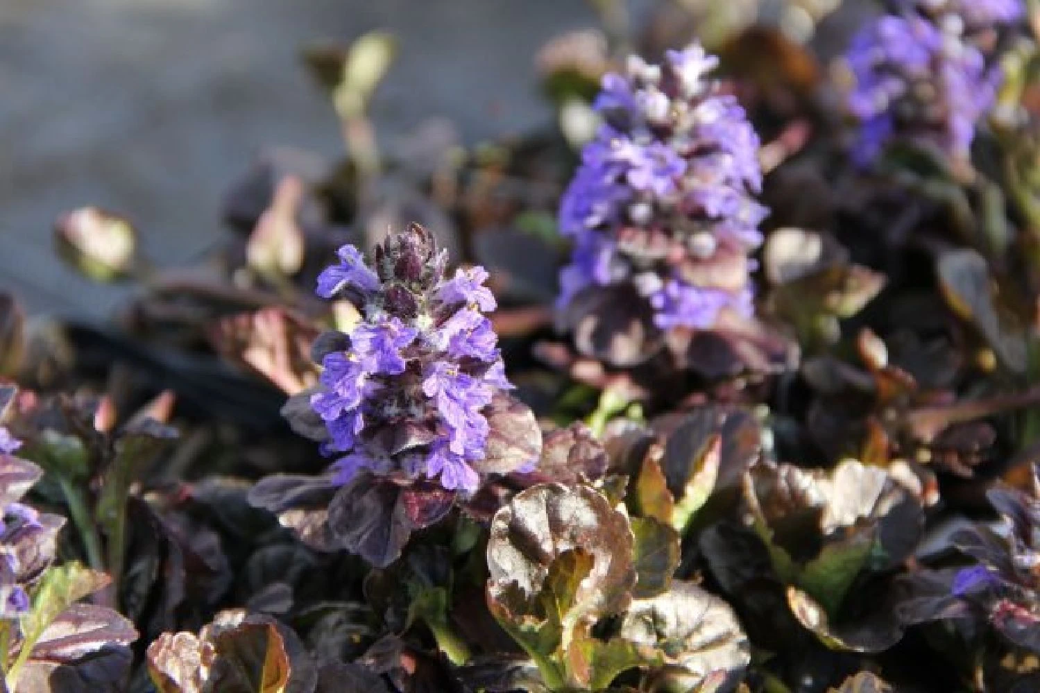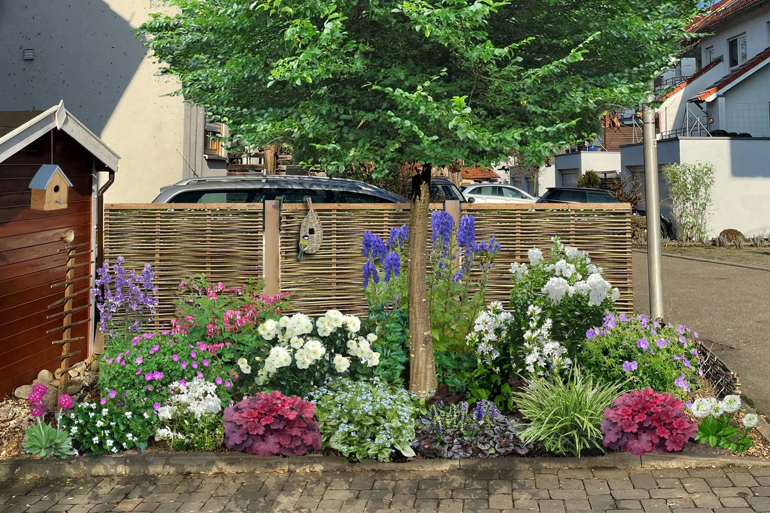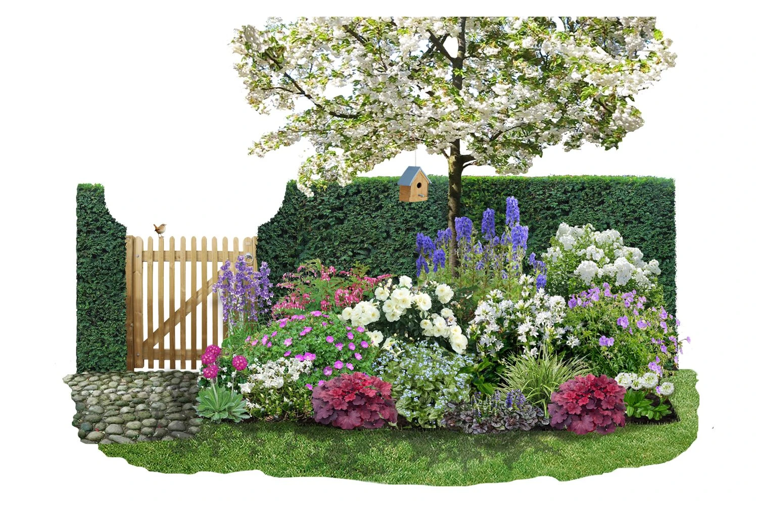 Von März bis Oktober reichen sich in diesem Ensemble die Pflanzen den Blüten-Staffelstab weiter, so dass es über Monate etwas Schönes zu betrachten gibt. Von Kugelprimeln über Teppich-Flammenblume und Kaukasusvergissmeinnicht bis hin zu Günsel und Pfingstveilchen reicht das Blütenangebot im Frühling. Beeindruckend auch das Tränende Herzen Ende April! Zur Rose im Juni gesellen sich dann zweierlei Storchschnäbel sowie Glockenblumen. Duftender Phlox verleiht dem Beet im Hochsommer ländlichen Charme und ist eine gern besuchte Nektarquelle für Schmetterlinge. Das Gartenjahr beschließen Herbst-Eisenhüte, die mit wundervollem Königsblau über dem Beet thronen. Doch der Schmuckwert des Beetes endet hier noch lange nicht, denn einige immergrüne Pflanzen wie weinrotes Purpurglöckchen und eine weißbunte Japansegge bieten selbst in der kalten Jahreszeit noch attraktive Blickfänge.