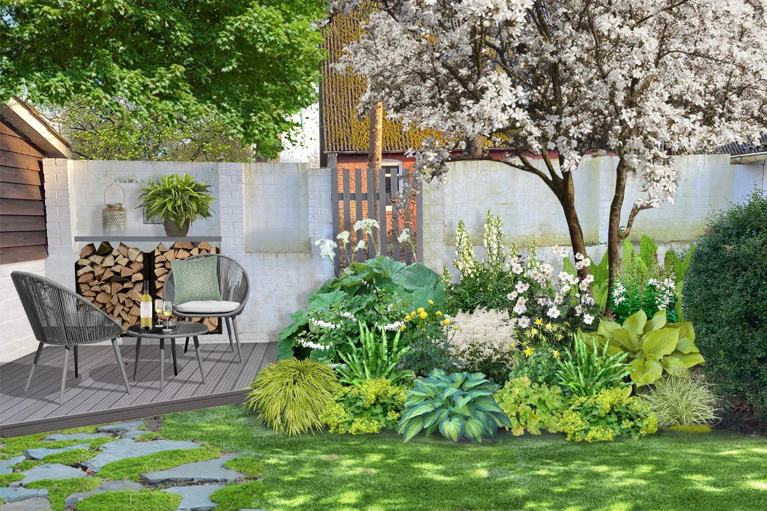 Das Staudenbeet ‚Crème Fraîche‘ bringt mit seinen frischen Weiß-, Zartgelb- und Grüntönen das nötige Licht in jede schattige Gartenecke.