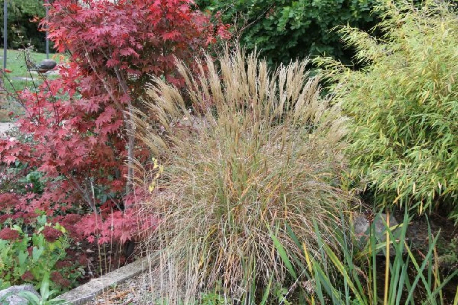 Leicht lässt sich eine Kiesflächen mit einem pflegeleichtem Beet „Gräsermeer“ beleben und sorgt dann für zart-wogende Ausblicke. Nur einmal im Frühjahr schneidet man die Gräser darin kräftig zurück. Den Rest des Jahres braucht man sich kaum um sie zu kümmern. Stattdessen belohnen uns Federborstengras, Reitgras, Rutenhirse, Wimper-Perlgras und Chinaschilf mit feinen Blatttexturen, prächtigen Gräserblüten und toller Herbstfärbung.