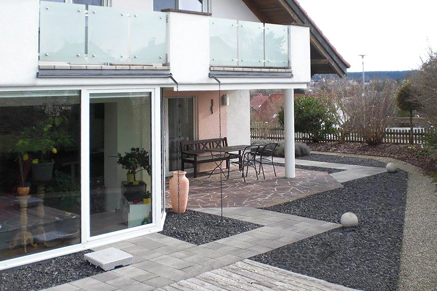 Gerade in Neubaugebieten werden Rasen und Beetflächen oft durch geometrische Kies- und Schotterflächen ersetzt, um Zeit bei der Gartenpflege zu sparen. Viele Bewohner sehnen sich jedoch nach kurzer Zeit schon nach einem natürlich aussehenden Gartenumfeld, da die Kiesflächen zu leblos wirken. In diesem eines modernen Einfamilienhauses war das Terrassenumfeld ähnlich karg gestaltet.