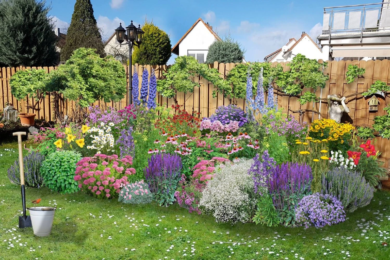 Die Beet-Idee „Ländlicher Zauber“ ist klassisch, zeitlos und hat eine opulente Aura, der man sich nur schwer entziehen kann. Die Rede ist von alten Bauerngärten, deren Kombination aus Nutz- und Zierpflanzen wieder ganz im Trend liegt. Alles, was man für eine gelungene Anlage benötigt, ist eine möglichst großzügig bemessene Beetfläche, wie in diesem Beispiel eines in die Jahre gekommenen Gartens. Auf 10 m² Fläche lässt sich mit dem Zeppelin-Beetpaket ‚Ländlicher Zauber‘ hier im Handumdrehen ein farbenfrohes Bauerngartenparadies schaffen, das von Frühjahr bis Spätherbst für einen konstanten Strom an Blüten und Duft sorgt.