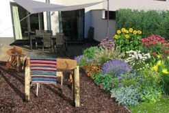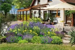 Gestalterisch lässt sich das Zeppelin-Beetpaket ‚Ländlicher Zauber‘ nicht nur für eine klassische Gartensituation sondern auch als Terrassen- oder Vorgartenbeet nutzen. Der Trick dabei ist die dachförmige Höhenstaffelung, die zwei Ansichtsseiten erlaubt. So sitzen die höchsten Pflanzen in der Mitte des Beetes. Zu den Rändern hin fällt es jeweils in der Höhe ab.