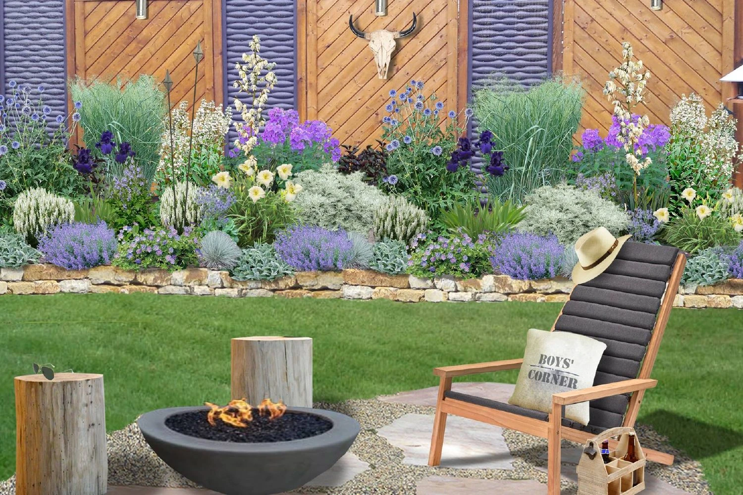 Um der geschlossenen Wand die Schwere zu nehmen, bietet es sich an, mit einem vorgelagerten Beet einen optimalen Übergang zwischen Garten und Grenze zu schaffen. Durch ein geschicktes Anheben der Beetfläche mit Hilfe einer niedrigen Stützmauer wird zudem im Hintergrund das Betonfundament des Sichtschutzzaunes kaschiert. Die Bepflanzung orientiert sich am Stil des Zaunes und ist – obwohl insgesamt eine Augenweide – eher maskulin, kräftig und in gedeckten Farbtönen gehalten. Das Beetpaket „Das Männerbeet“ wurde für diesen Garten mit etwa 5 m Breite zweimal verwendet, um die Fläche gut auszufüllen. Verwendet man es mehrfach, kann man auch die Anordnung der Pflanzen ein wenig verändern, um einen Spiegelungseffekt zu vermeiden.