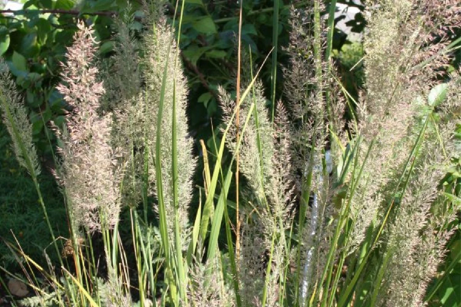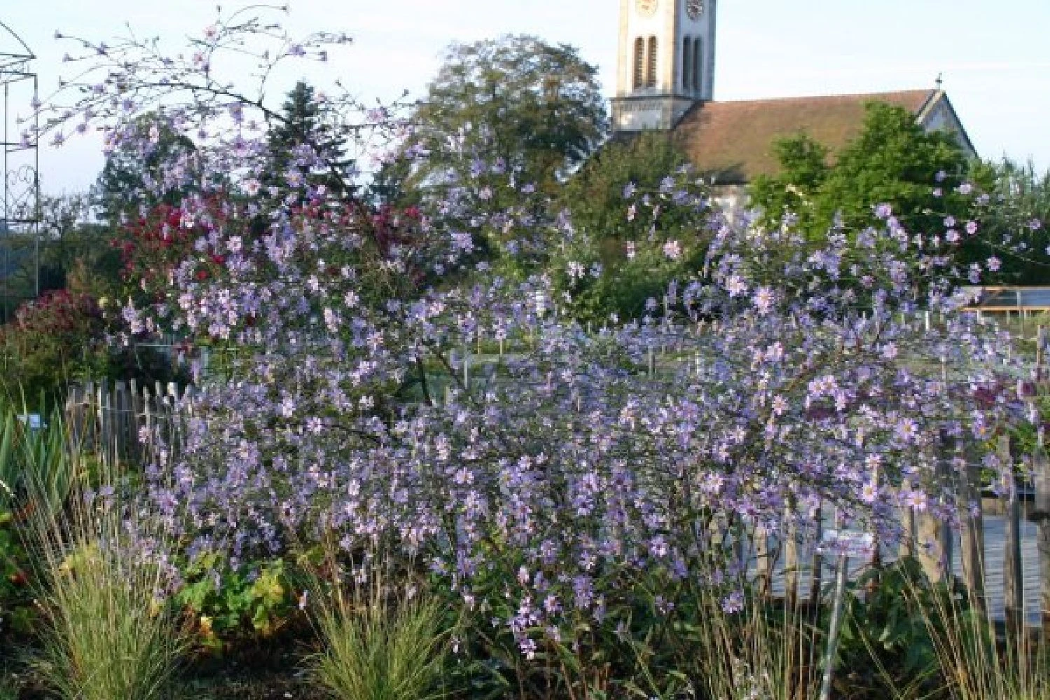 Zartlila Amsonie, leuchtstarker Scheinsonnenhut und kleiner Wiesenknopf eröffnen die Blühsaison vorm Haus. Dazu gesellen sich in rascher Abfolge Duftnessel, Kerzenknöterich, Fenchel, Knautie, Sonnenhut, Fetthenne und eine zarte Herbstaster. Kräftiger, rosa Wasserdost sorgt im Hintergrund des Beetes zusammen mit zwei herrlichen Chinaschilf für Höhe und verleiht der Pflanzung optisches Gewicht. Ab Spätsommer zeigen dann auch die kleineren Gräser wie Diamantgras und Lampenputzergras was in ihnen steckt, wenn sie ihre zarten Blütenstände präsentieren. Im Frühherbst gibt es dabei nichts Schöneres, als an einem kühlen, sonnigen Morgen die Tautropfen in diesen Gräsern funkeln zu sehen.