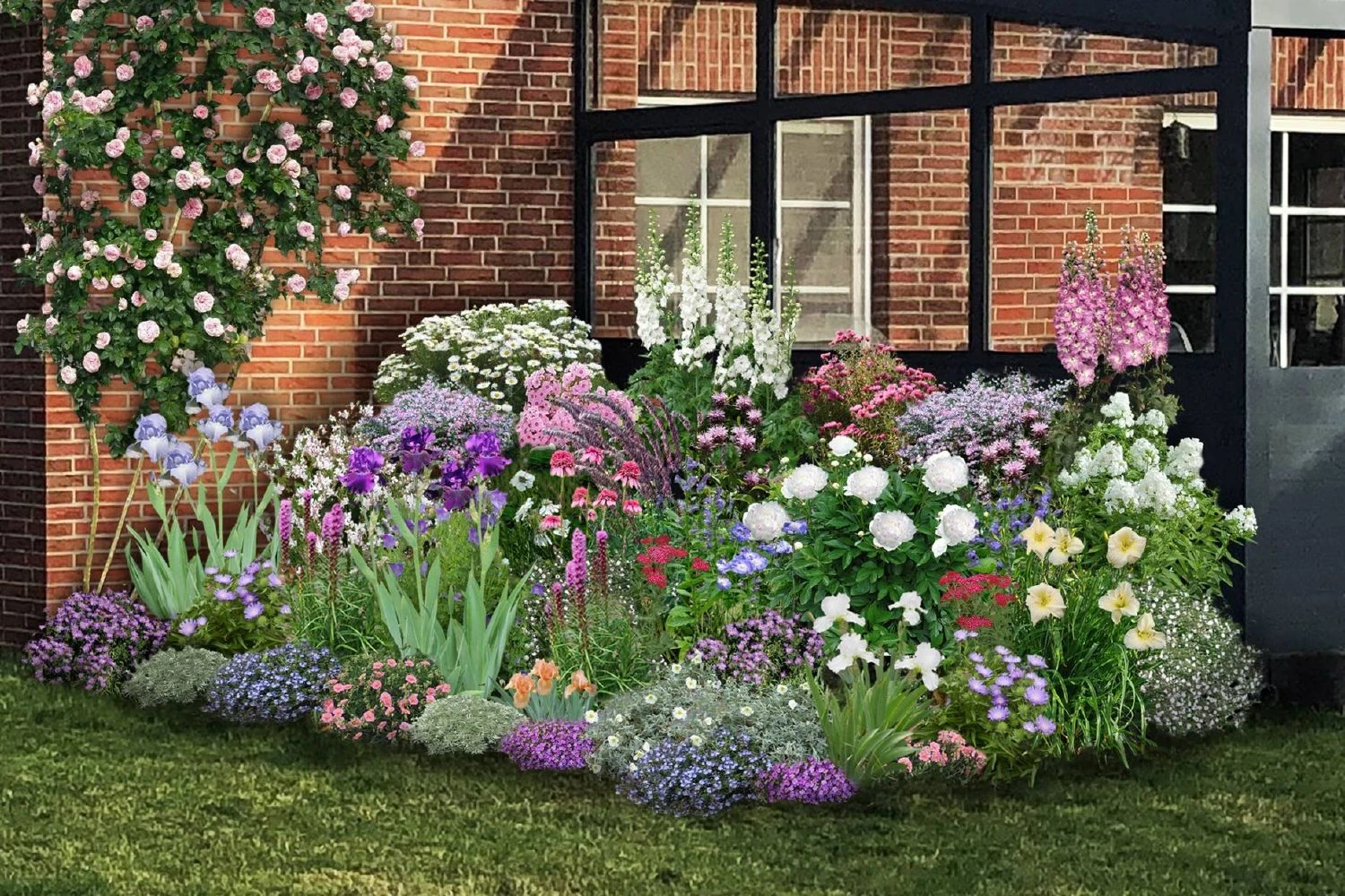 Auf einer rechteckigen Fläche tummelt sich hier eine erlesene Pflanzengemeinschaft aus zart-pastellfarbenen Prachtstauden und Begleitern, die von April bis Oktober für einen herrlichen Anblick sorgen. Ob duftende Bartiris oder weiße Edelpfingstrose im April/Mai, hoher Rittersporn und Flammenblume im Juni/Juli oder Herbstastern ab September, dieses Beet erfreut mit seinem nicht enden wollenden Blütenreigen. So viele tolle Stauden gibt es darin zu entdecken: Schwebende Skabiosen, eine cremefarbene Taglilie, blaue Lobelien und Ballonblume, samtig-rote Schafgarben, puschelige Prachtscharten, dauerblühende Prachtkerzen oder aromatische Indianernesseln. Im Vordergrund entzücken einen überreich blühender Polsterehrenpreis, feinlaubige, silbrig schimmernde Edelraute, Sonnenröschen und frühblühendes Blaukissen.