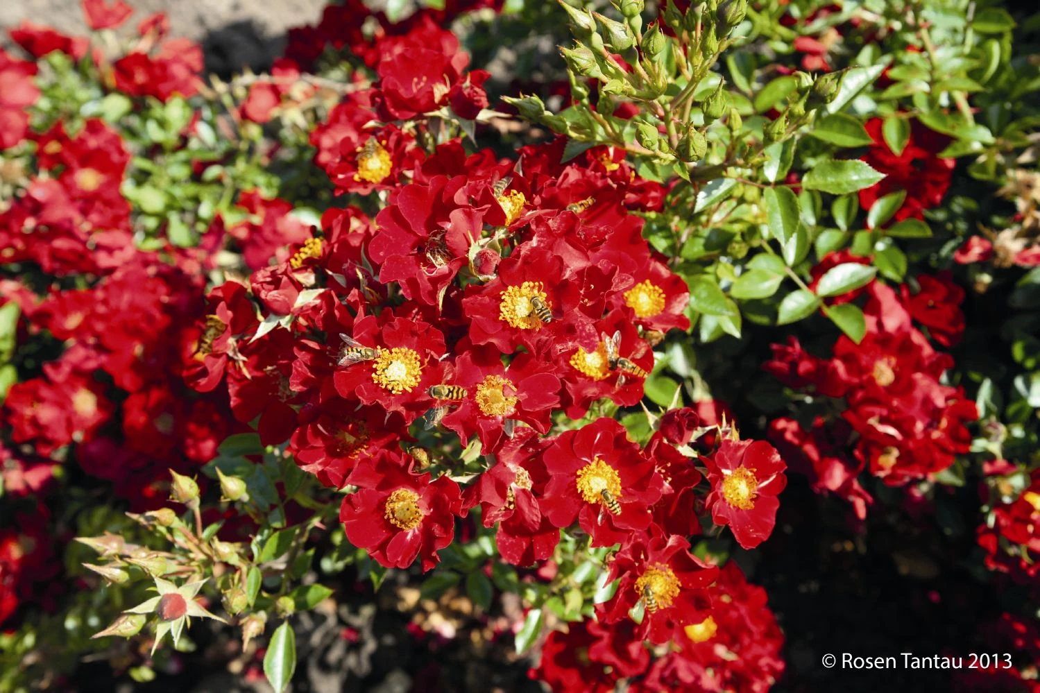 Die Rose ‚Bienenweide‘ in Rot besitzt einfache Blüten. Ihr Wuchs ist kompakt und kissenförmig.